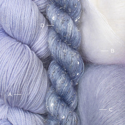 Kit Lavender: Alegria color Lavender (Hilado A) + Super Kid Mohair Loves Silk color 001 (Hilado B) + Super Kid Mohair Loves Silk color 035 (Hilado C) + Beaded Mohair Sequins color 2239 (Hilado D)