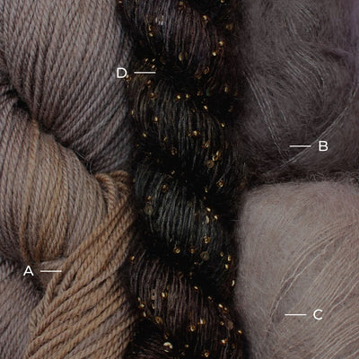 Kit Natural: Alegria color Natural (Hilado A) + Super Kid Mohair Loves Silk color 058 (Hilado B) + Super Kid Mohair Loves Silk color 042 (Hilado C) + Beaded Mohair Sequins color 250 (Hilado D)