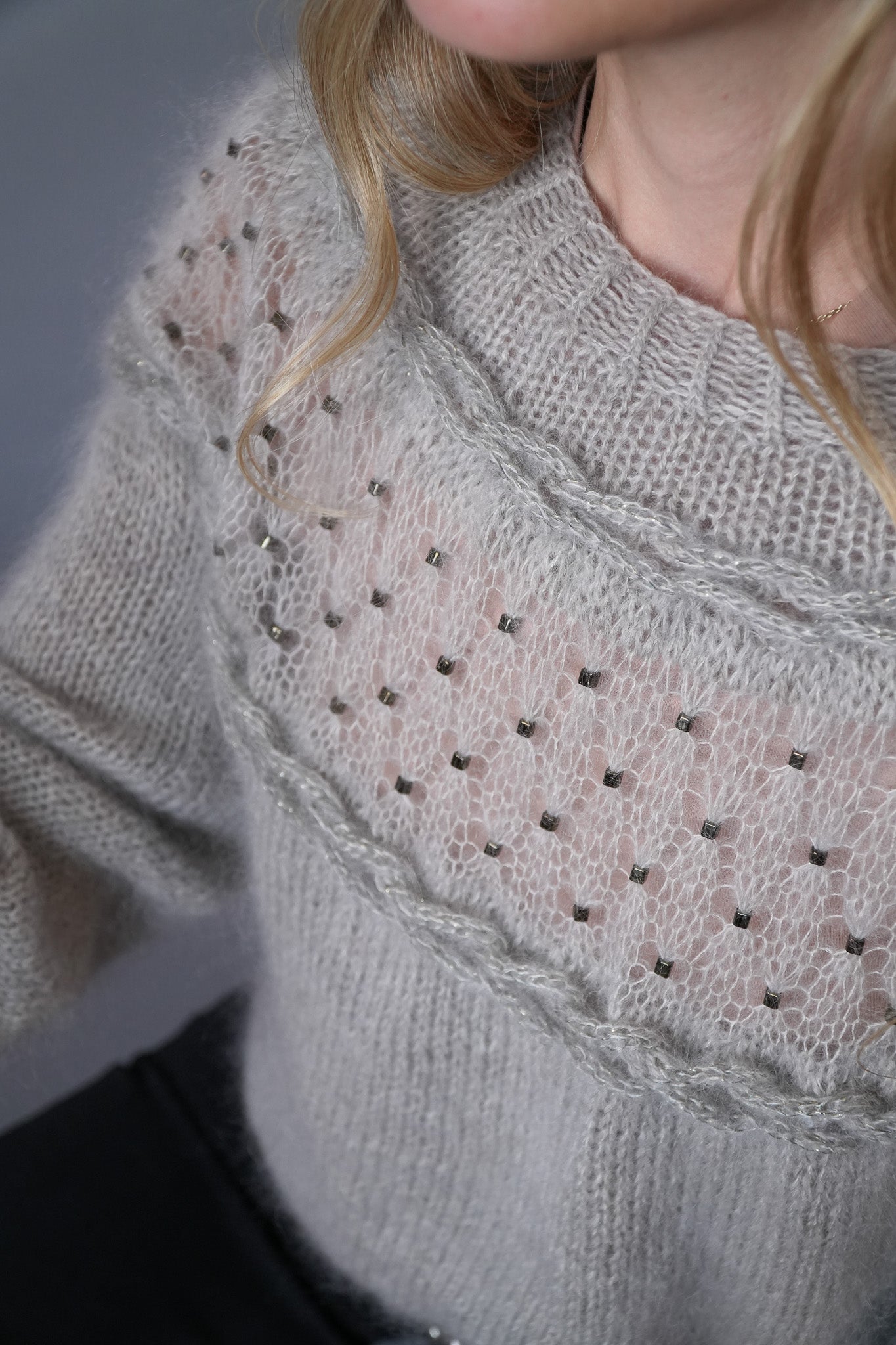 - Hilado B: aprox. 75 (90, 100, 125, 140) (150, 175, 190, 200) g / 696 (835, 928, 1160, 1299) (1392, 1624, 1763, 1856) yds o 636 (763, 848, 1060, 1187) (1272, 1484, 1611, 1696) m. / Hilado Sugerido: Isager – Silk Mohair / 60% kid mohair, 40% seda, (232 yds o 212 m / 25 g) /3 (4, 4, 5, 6) (6, 7, 8, 8) ovillos / color: S2.