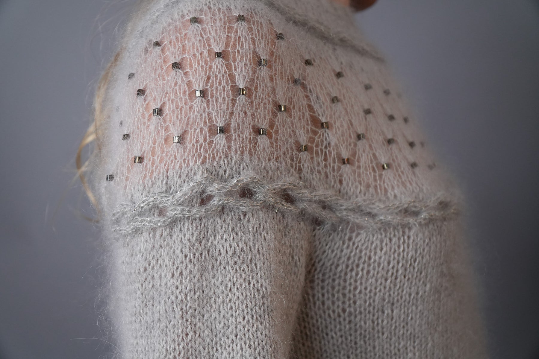 Este es un diseño elegante y delicado, donde quise reunir dos técnicas muy características de mi trabajo. Una de ellas es el uso de una sola mostacilla trabajada en tres puntos, que aporta un brillo sutil y textura al tejido. La otra es una trenza tridimensional creada con I-cord.
