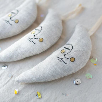 Este es un encantador adorno de luna hecho con lino natural. Está cosido en la maquina de coser con hilo de bordar y hilo metálico. Mide aproximadamente 10.1 cm de largo y 5.8 cm de ancho.