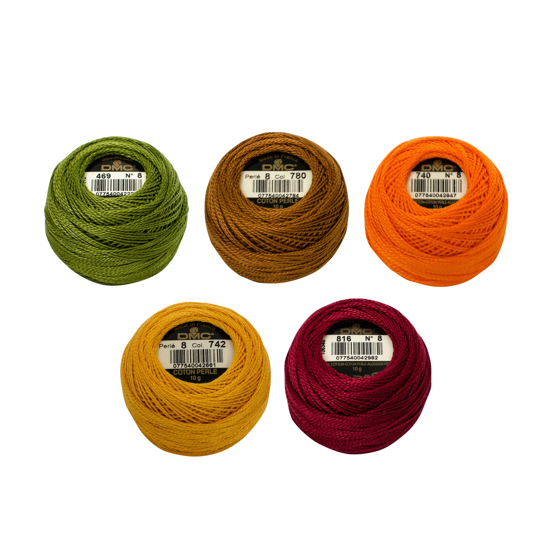 Incluye: 5 ovillos de hilo perlé n°8 de DMC, colores 0469 (verde) +0780 (Ocre) + 0740 (Naranjo) + 0742 (Ocre) + 0816 (Rojo).